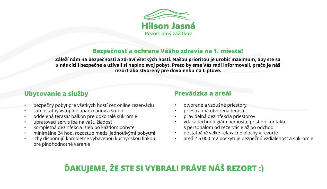 If you are looking for the vacations in Liptov region or Jasná and you are looking for the guest house in this case be sure that the Hilson Apartments will fully satisfy all your requirements as for a good location. It´s simply close everywhere from us. For example, when you want to visit the Jasná resort, accommodation in our apartments was the right choice, not 10 km away and you're there. Also well-known Aquapark Tatralandia or water dam Liptovská Mara is just 10 km away from us. Demänovská Cave is just 3 km away. In short, from our Hilson apartments everything is close and it´s the right choice for lodging demand in Jasná.