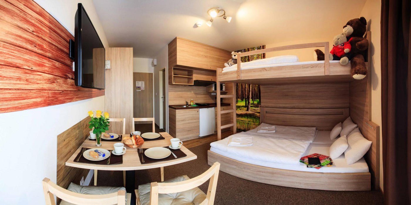 Niniejsze studio rodzinne przeznaczone jest dla dwóch osób dorosłych i dwójki dzieci, lub dla trzech osób dorosłych. Jest tańszym wariantem w porównaniu z noclegiem w aparmamentach.