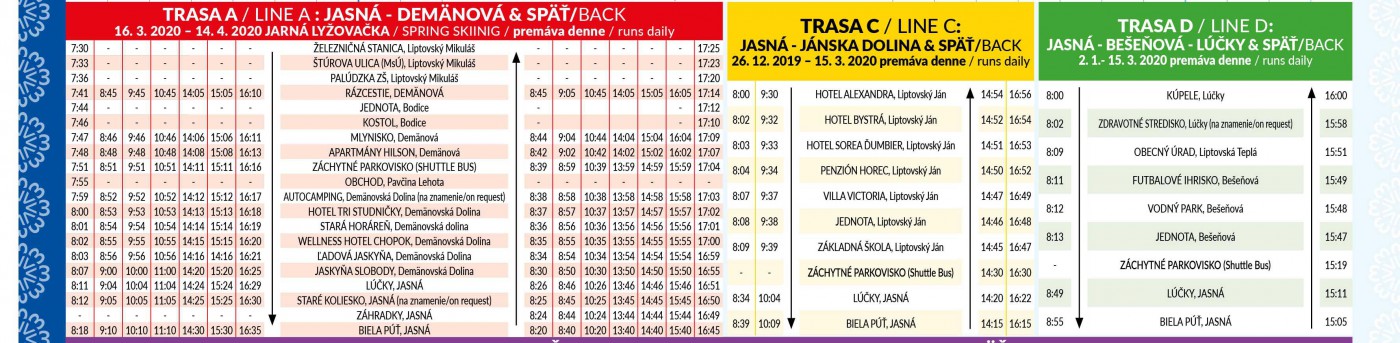 | RÁZCETSIE, Demänová | 8:14 | 8:44 | 9:34 | 10:14 | 12:54 | 14:19 | 15:49 | 8:14 | 9:34 | 15:49 | |