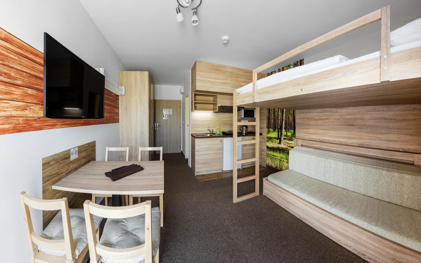 Moderné rodinné štúdio s výhľadom na hory je vhodné pre dve dospelé osoby a dve deti alebo pre tri dospelé osoby. Predstavuje lacnejší variant ubytovania pre viaceré osoby.